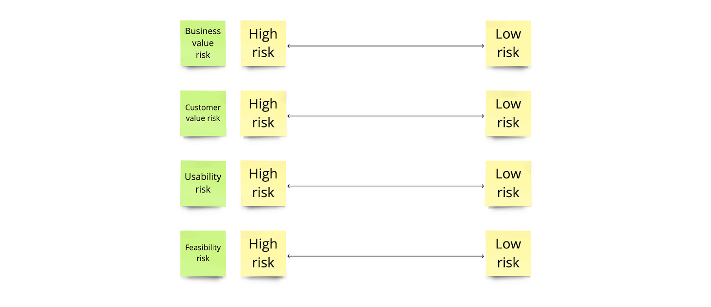 We know de-risking is a key element for success from decades of research, best practices, and case studies, and yet…it’s still tough. Risk can often feel like a vague concept, which is why I think the best way to successfully minimize it is by being deliberate about it. I think this is partially why Marty Cagan’s four big risks resonated immediately with so many; it broke risk down into four components that are directly relevant to any cross-functional team. As a reminder, the four risks when working on a new initiative are: