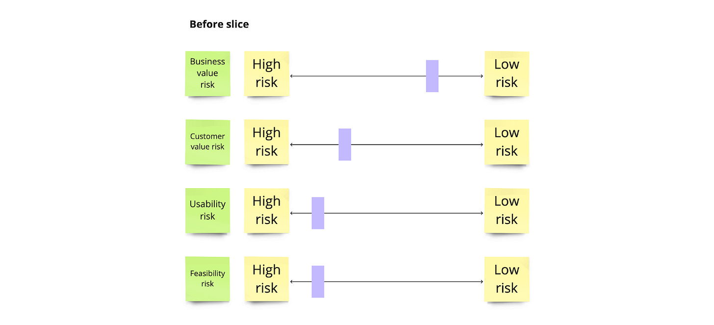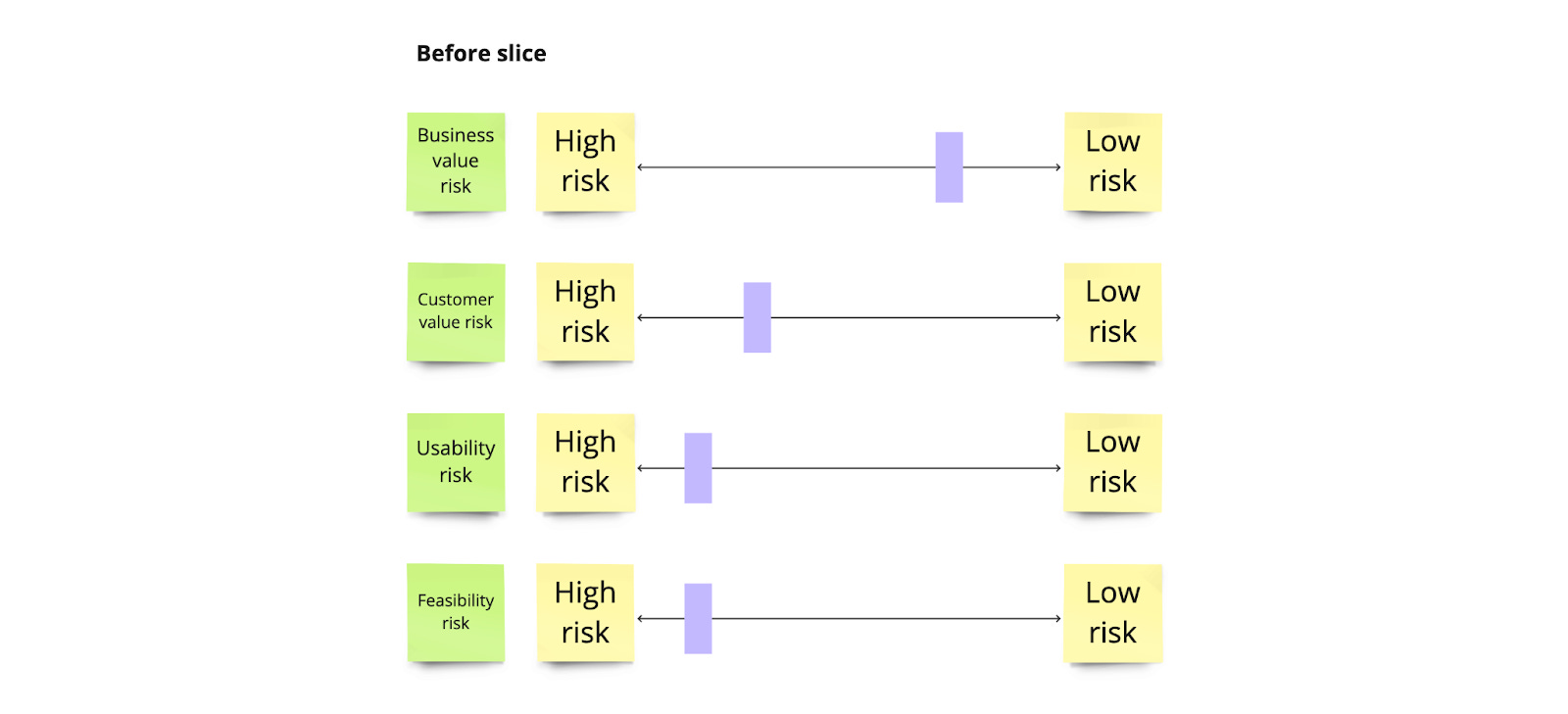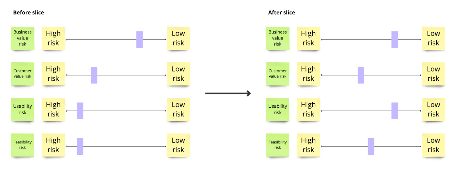 It was this activity that led our team to experiment with a way of easily visualizing the four risks, by plotting them on sliders, from “High risk” to “Low risk”. The goal was to have an extremely simple tool that facilitated conversations between the team, to identify the focus areas for de-risking, and to validate whether we were on the right track. In time, all four risks should lean towards “Low risk”, as we gain confidence that we’re building the right solution for the right opportunity.